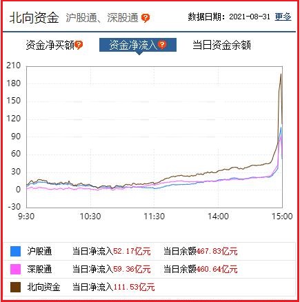 截至收盘: 北向资金净流入111.53亿元,其中沪股通资金净流入52.17亿元,深股通资金净流入59.36亿元。