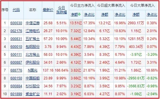 今日沪深两市主力资金净流入排名前5的个股分别为:中信证券、江特电机、五矿稀土、包钢股份、北方稀土;主力资金净流出排名前5的个股分别为:隆基股份、比亚迪、中远海控、宁德时代、爱尔眼科。