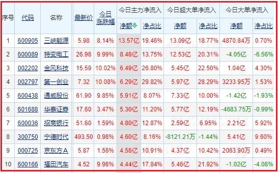 今日沪深两市主力资金净流入排名前5的个股分别为:三峡能源、特变电工、金风科技、第一创业、通威股份;主力资金净流出排名前5的个股分别为:中远海控、五 粮 液、沃森生物、格力电器、长春高新。