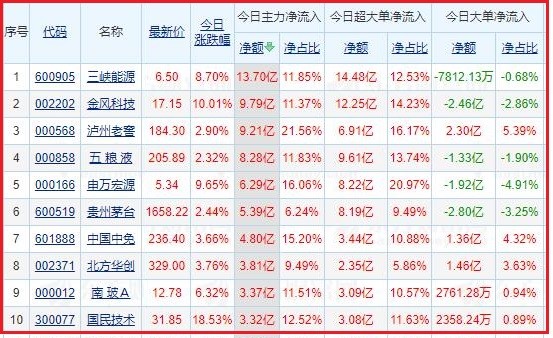 今日沪深两市主力资金净流入排名前5的个股分别为:三峡能源、金风科技、泸州老窖、五 粮 液、申万宏源;主力资金净流出排名前5的个股分别为:包钢股份、天齐锂业、比亚迪、五矿稀土、北方稀土。