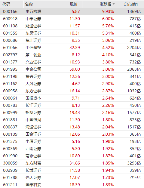 券商板块拉升走高,申万宏源封涨停,中泰证券涨6%,财通证券、东吴证券、东北证券涨超5%,中信建投、第一创业、东方证券等跟涨。