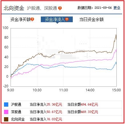 截至收盘: 北向资金净流入76.03亿元,其中沪股通资金净流入25.36亿元,深股通资金净流入50.67亿元。