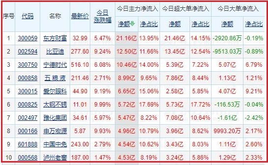 今日沪深两市主力资金净流入排名前5的个股分别为:东方财富、比亚迪、宁德时代、五 粮 液、爱尔眼科;主力资金净流出排名前5的个股分别为:金风科技、紫金矿业、三峡能源、隆基股份、协鑫集成。