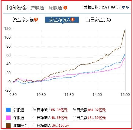 截至收盘: 北向资金净流入104.61亿元,其中沪股通资金净流入55.93亿元,深股通资金净流入48.68亿元。