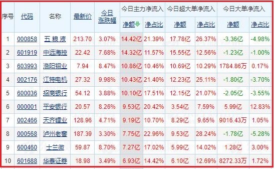 今日沪深两市主力资金净流入排名前5的个股分别为:五 粮 液、中远海控、洛阳钼业、江特电机、招商银行;主力资金净流出排名前5的个股分别为:比亚迪、中国船舶、盐湖股份、包钢股份、美锦能源。