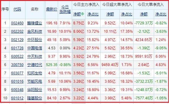 今日沪深两市主力资金净流入排名前5的个股分别为:赣锋锂业、金风科技、中环股份、中国电信、中天科技;主力资金净流出排名前5的个股分别为:五 粮 液、比亚迪、北方稀土、格力电器、润和软件。