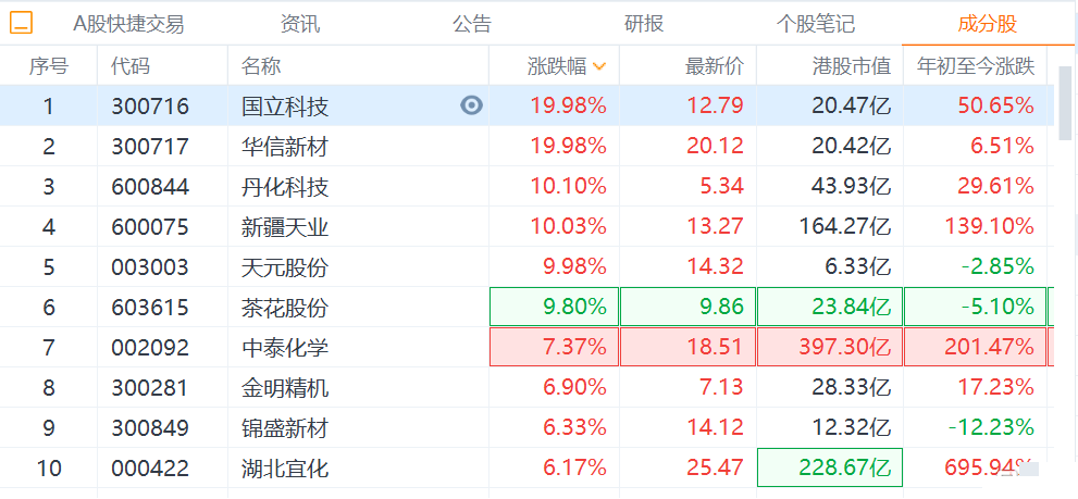 今早可降解塑料股集体上涨,国立科技,华信新材,丹化科技,新疆天业,天元股份涨停,中泰化学涨超7%,湖北宜化,锦盛新材,金明精机涨超6%。