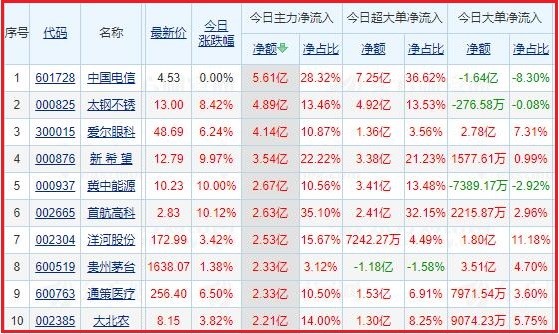 今日沪深两市主力资金净流入排名前5的个股分别为:中国电信、太钢不锈、爱尔眼科、新 希 望、冀中能源;主力资金净流出排名前5的个股分别为:天齐锂业、盐湖股份、赣锋锂业、比亚迪、隆基股份。