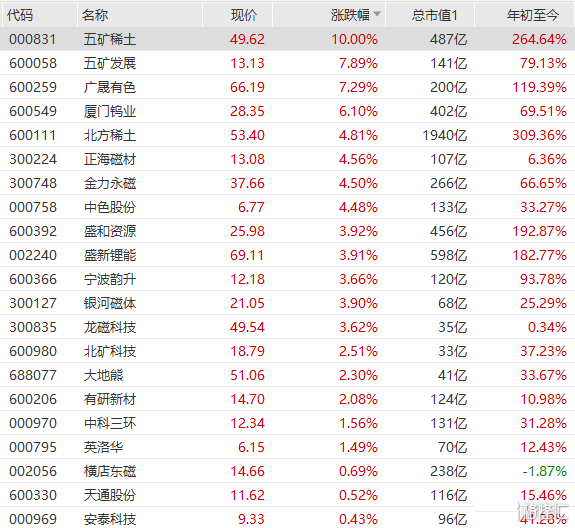 稀土永磁板块走高,五矿稀土涨停,五矿发展、广晟有色涨超7%,厦门钨业、北方稀土、正海磁材、金力永磁等涨幅居前。五矿稀土实际控制人中国五矿集团与中国铝业集团、赣州市政府等正在筹划相关稀土资产的战略性重组。