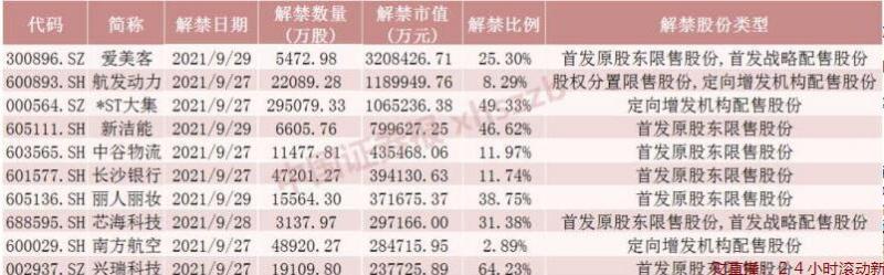 具体来看,爱美客9月29日将解禁5472.98万股,为首发原股东限售股份和首发战略配售股份;航发动力9月27日将解禁2.21亿股,为股权分置限售股份和定向增发机构配售股份;*ST大集9月27日将解禁29.51亿股,均为定向增发机构配售股份。