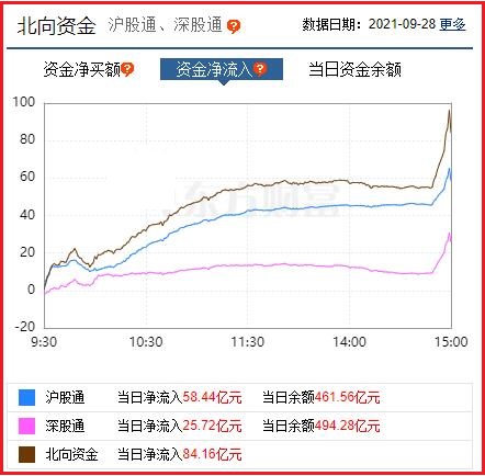 截至收盘: 北向资金净流入84.16亿元,其中沪股通资金净流入58.44亿元,深股通资金净流入25.72亿元。