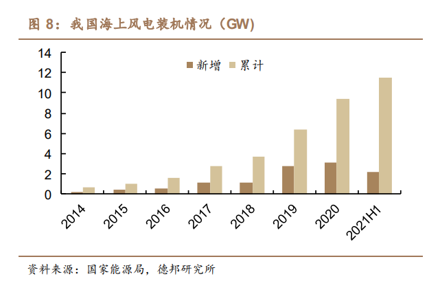 三峡能源为国内最早布局海上风电的企业之一,先发优势明显,截至2021年上半年,公司已投运海上发电项目149万kW,在建规模294万kW,排名行业第一,占全国全部风电在建规模约20%。