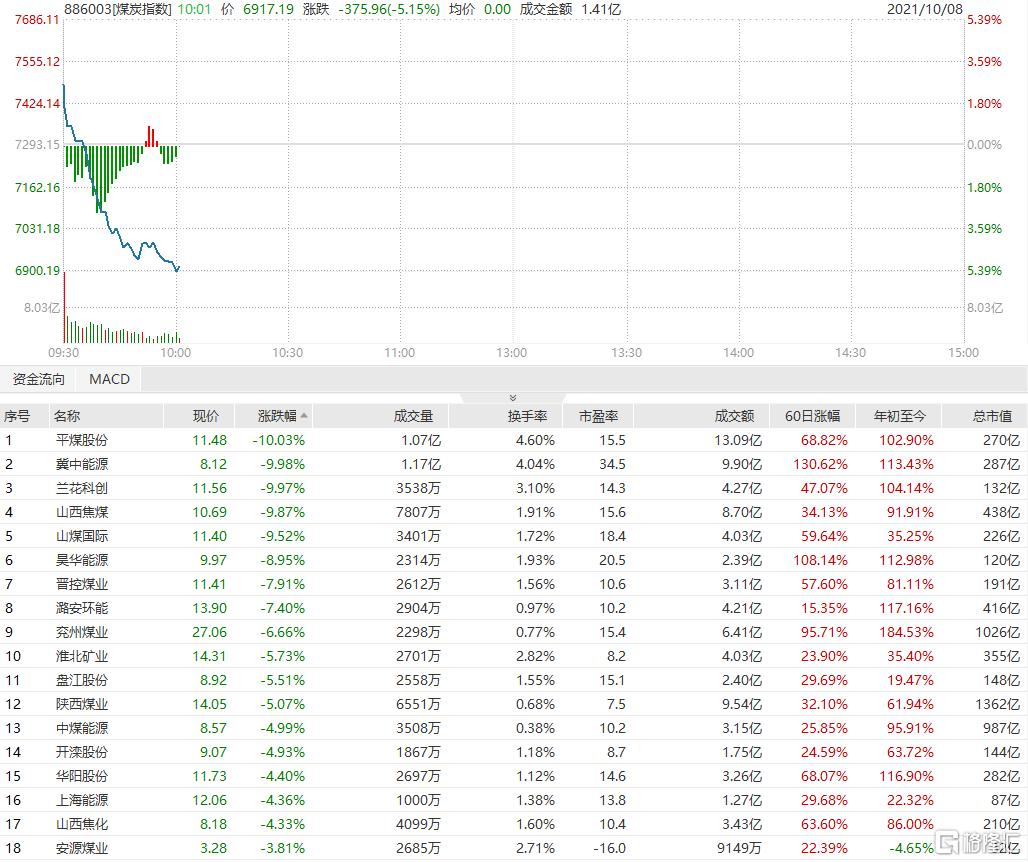 动力煤主力合约盘中跳水,现跌超5%,此前一度涨超4%。煤炭板块继续下滑,平煤股份、冀中能源、兰花科创跌停,山西焦煤、山煤国际等大跌。