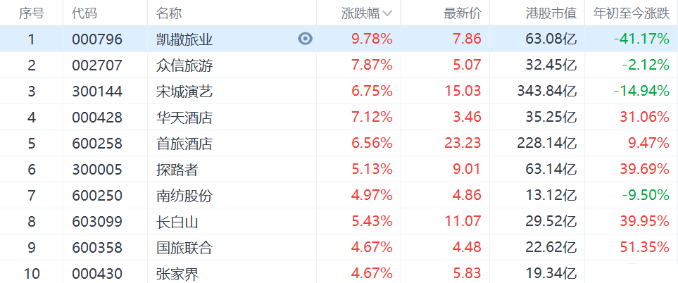 A股旅游股集体大涨,其中凯撒旅业一度涨停,众信旅游,华天酒店涨7%,宋城演艺,首旅酒店涨6%,探路者涨5%。