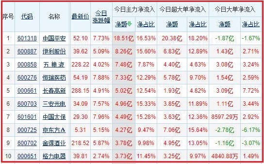 今日沪深两市主力资金净流入排名前5的个股分别为:中国平安、伊利股份、五 粮 液、恒瑞医药、长春高新;主力资金净流出排名前5的个股分别为:中国能建、隆基股份、特变电工、三峡能源、节能风电。
