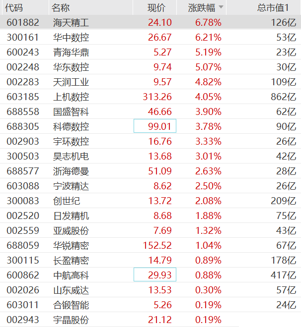 工业母机概念板块拉升,海天精工、华中数控双双涨超6%,华东数控、青海华鼎,上机数控等跟涨。
