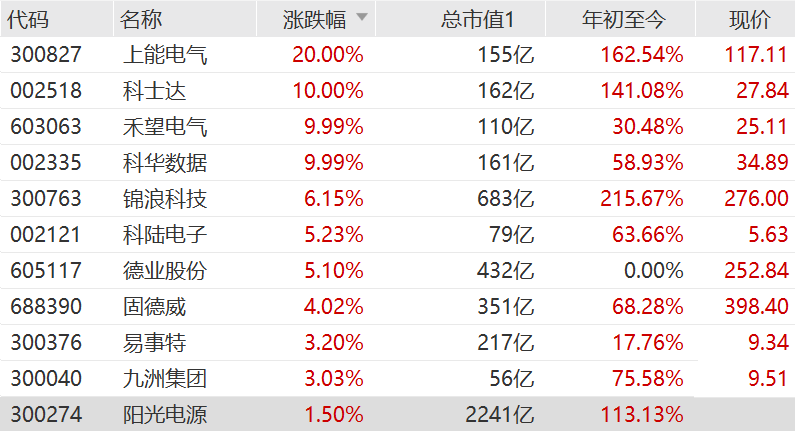 上能电气涨20%涨停,科士达、禾望电气、科华数据涨10%涨停,锦浪科技涨超6%,科陆电子、德业股份涨超5%,固德威涨超4%。