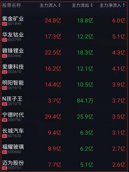 资金净流入十大人气热股: