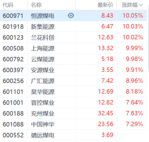煤炭股持续拉升,恒源煤电、新集能源、兰花科创、上海能源、安源煤业等多股涨停,昊华能源涨超8%,中国神华、兖州煤业涨超7%。动力煤主力合约触及涨停,涨幅11%,报1829元/吨,续创历史新高。