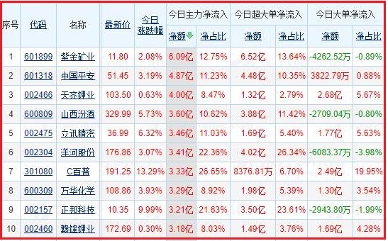 今日沪深两市主力资金净流入排名前5的个股分别为:紫金矿业、中国平安、天齐锂业、山西汾酒、立讯精密;主力资金净流出排名前5的个股分别为:北方稀土、东方财富、欣旺达、通威股份、和邦生物。