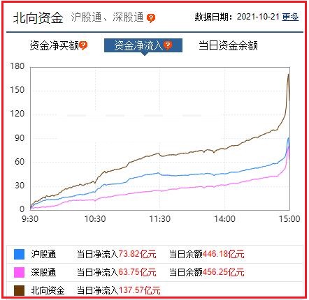 截至收盘: 北向资金净流入137.57亿元,其中沪股通资金净流入73.82亿元,深股通资金净流入63.75亿元。