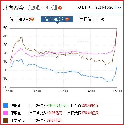 截至收盘: 北向资金净流入39.87亿元,其中沪股通资金净流出亿0.49元,深股通资金净流入40.36亿元。