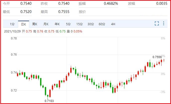 据路透社报道,澳大利亚储备银行没有在此类操作的通常时间购买关键的 2024 年 4 月债券。由于澳大利亚储备银行未捍卫债券目标,市场预期澳大利亚储备银行政策制定者将在通胀压力上升的情况下放弃该计划。继此事件后,澳大利亚储备银行将于下周二召开 11 月货币政策会议。汇价现报0.7534,跌幅0.13%