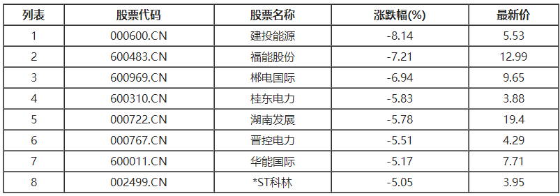 电力行业板块下挫,建投能源(000600.CN)跌8.14%