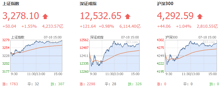 截止收盘,沪指涨1.55%,深成指涨0.98%,创业板指涨1.44%。沪深两市成交连续第三个交易日破万亿。