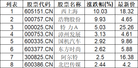 汽车服务板块拉升,西上海(605151.CN)涨10.03%