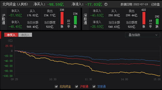 7月19日,截至A股收盘,统计数据显示北向资金合计净卖出98.59亿元,其中沪股通净卖出57.95亿元,深股通净卖出40.64亿元。北向资金成交金额969.83亿元,占A股总成交额9.73%,交易活跃度下降8.50%,其中沪股通买入金额176.82亿元,卖出金额234.77亿元,深股通买入金额258.80亿元,卖出金额299.44亿元。