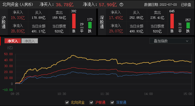 7月20日,截至A股收盘,统计数据显示北向资金合计净买入36.77亿元,其中沪股通净买入19.33亿元,深股通净买入17.44亿元。北向资金成交金额826.72亿元,占A股总成交额8.68%,交易活跃度下降14.76%,其中沪股通买入金额178.89亿元,卖出金额159.56亿元,深股通买入金额252.85亿元,卖出金额235.41亿元。