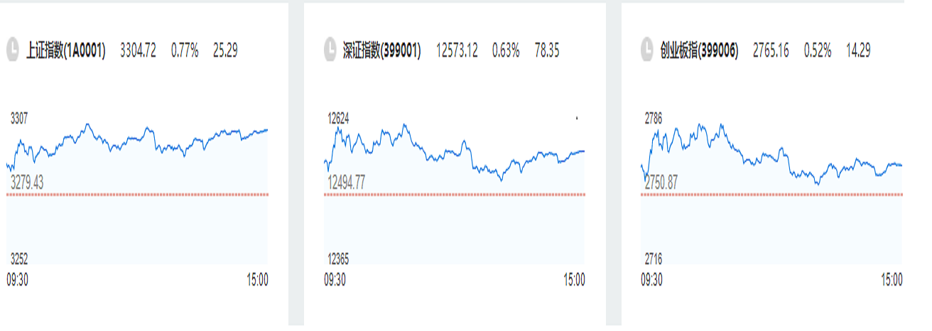 周二欧美股市反弹,周三A股三大指数集体高开,早盘沪指震荡上行重返3300点,深成指、创业板指冲高回落,创业板指一度涨超1%;午后市场呈现横盘震荡态势,三大指数集体收涨。