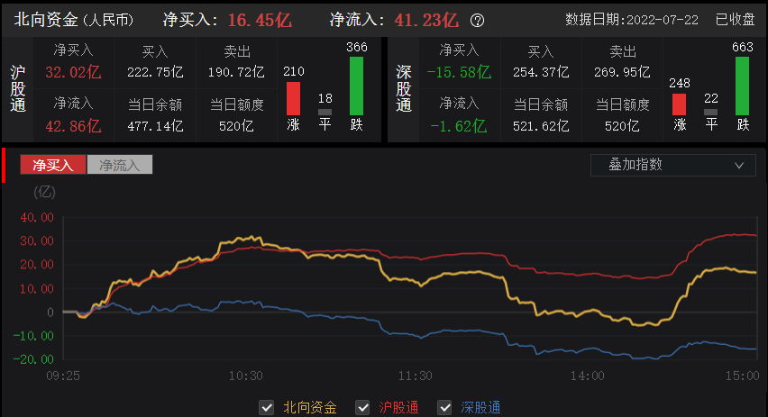 7月22日沪指下跌0.06%,北向资金合计买入成交477.12亿元,卖出成交460.67亿元,合计成交额937.79亿元。全天成交净买入16.45亿元,其中,沪股通合计成交额413.47亿元,成交净买入32.03亿元;深股通合计成交524.32亿元,成交净卖出15.58亿元。