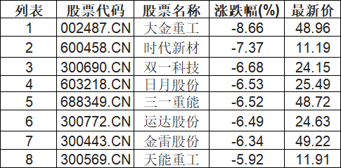 风电设备板块下挫,大金重工(002487.CN)跌8.66%