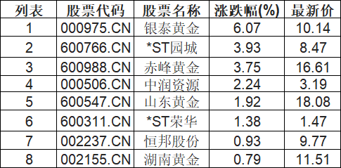 贵金属板块拉升,银泰黄金(000975.CN)涨6.07%