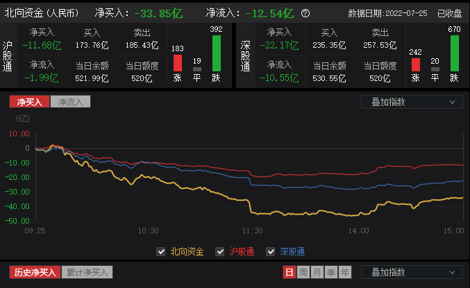 北向资金全天净流出33.85亿元。其中,沪股通资金净流出11.68亿元,深股通资金净流出22.17亿元。