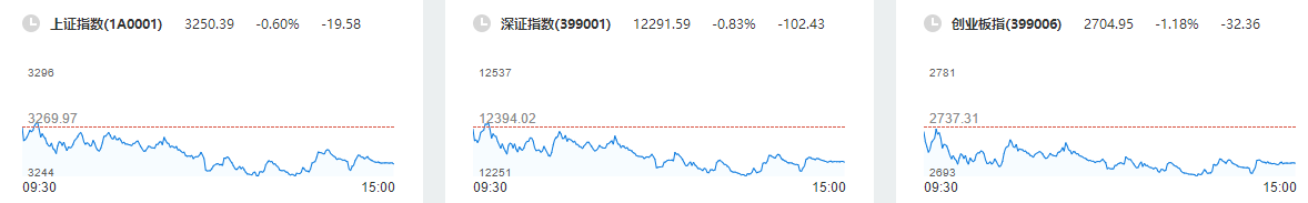 今日早盘,沪深指数平开后震荡回落,猴痘概念、汽车拆解、体外诊断等领涨,电池和新能源车概念整体回落。午后,两市再创新低后小幅反弹。截止收盘,沪指下跌0.60%,报3250.39点,深成指下跌0.83%,报12291.59点,创业板指数下跌1.18%,报2704.95点。