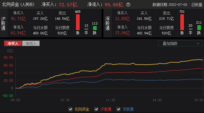 7月26日,北向资金今日净买入72.57亿元。其中,沪股通净买入50.72亿元,深股通净买入21.85亿元。