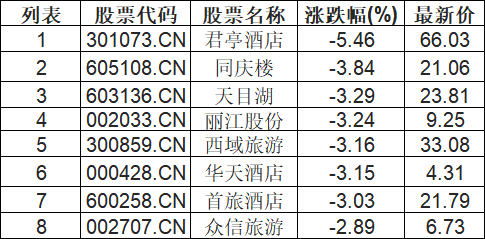 旅游酒店板块下挫,君亭酒店(301073.CN)跌5.46%
