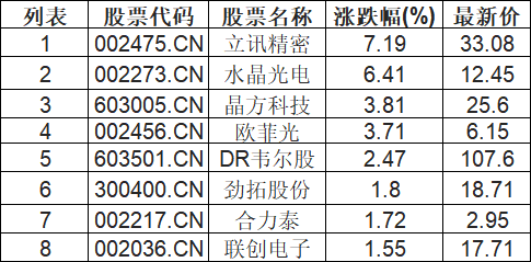 3D摄像头板块拉升,立讯精密(002475.CN)涨7.19%