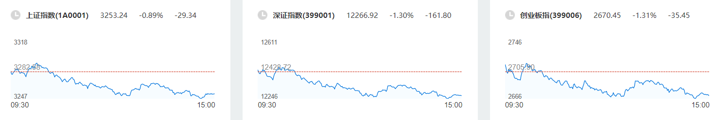截止收盘,两市双双走低,沪指跌0.89%报3253.24点,成交4106亿元;深成指跌1.30%报12266.92点,成交5962亿元。创业板指下跌1.31%,报2670.45点。