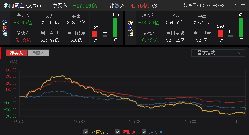 资金上,北向资金全天流出17.19亿元,沪股通净卖出3.95亿元;深股通净卖出13.24亿元。7月29日沪指下跌0.89%,北向资金合计买入成交481.03亿元,卖出成交498.21亿元,合计成交额979.24亿元。全天成交净卖出17.18亿元,其中,沪股通合计成交额436.99亿元,成交净卖出3.95亿元;深股通合计成交542.25亿元,成交净卖出13.23亿元。