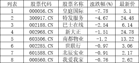 房地产服务板块下挫,皇庭国际(000056.CN)跌7.78%