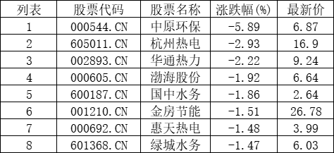 公用事业板块下挫,中原环保(000544.CN)跌5.89%