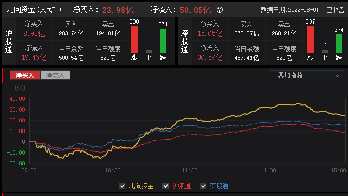 截至目前,北向资金净流入超40亿元,其中,沪股通净流入超18亿元,深股通净流入超23亿元。