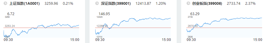 今日早盘,A股三大指数低开,随后冲高,深成指涨超1%,创业板指涨超2%。盘面上,PCB概念、汽车整车、动力电池回收板块涨幅居前,一体化压铸、培育钻石、房地产板块跌幅居前。截至今日午间收盘,沪指报3258.46,涨幅0.16%;深成指报12402.91点,涨幅1.11%;创业板指报2724.47点,涨幅2.02%。