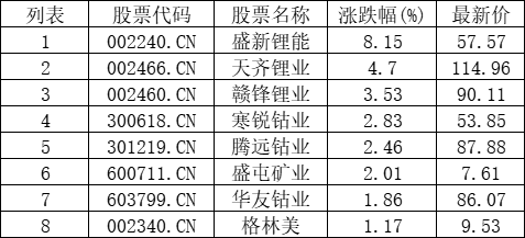 能源金属板块拉升,盛新锂能(002240.CN)涨8.15%