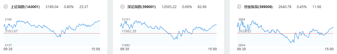 截至今日午间收盘,沪指报3168.39点,涨幅0.15%;深成指报11987.28点,涨幅0.04%;创业板指报2623.64点,跌幅0.20%。