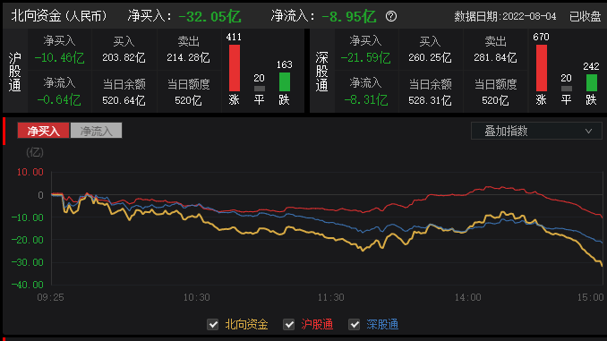 数据显示,北向资金与指数背道而驰,全天净卖出32.05亿元,连续3日净卖出;其中沪股通净卖出10.46亿元,深股通净卖出21.59亿元。